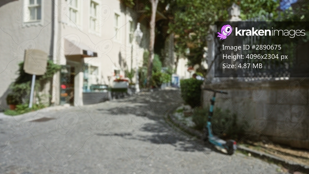 Sunlit narrow cobblestone street lined with storefronts in soft defocused bokeh; background backplate copyspace calm.