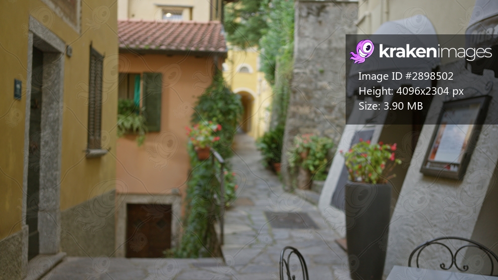 Sunlit narrow stone alley with potted plants and cafe awnings, soft defocused bokeh alley; background backdrop copyspace calm.