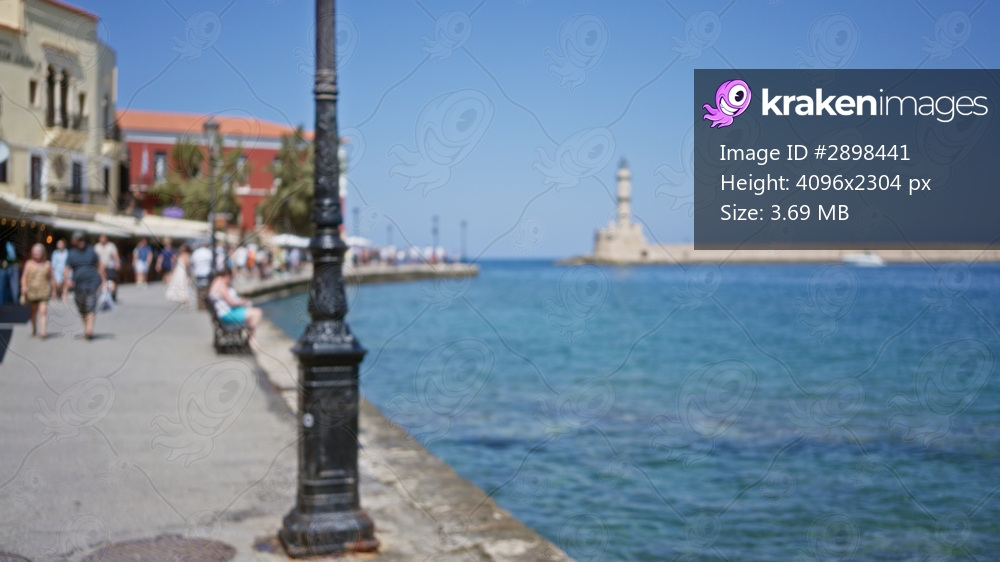 Sunlit seaside promenade along a harbor softly defocused bokeh outdoor; background backdrop copyspace calm.