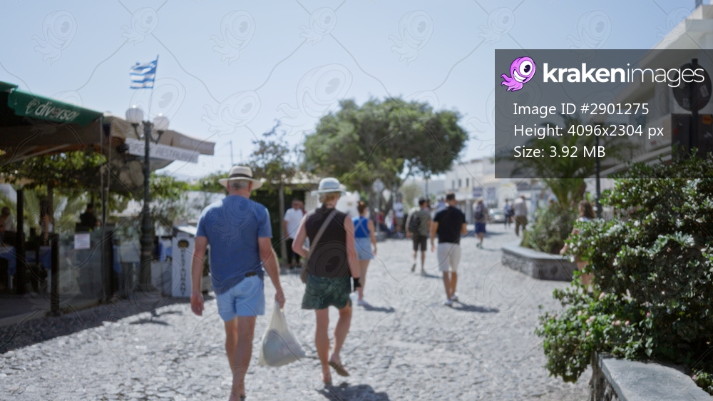 Sunlit seaside scene with cobblestone pedestrian way, shops, awnings and palms captured in soft blurred bokeh street; background backdrop copyspace calm.