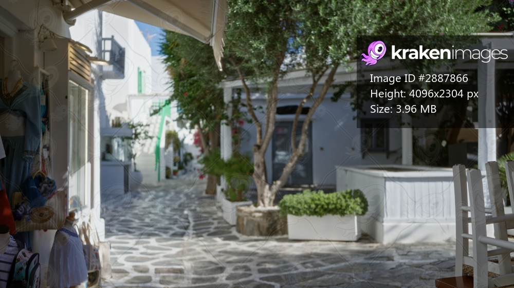 Sunlit stone alley lined with whitewashed buildings, potted plants and shaded seating, soft defocused bokeh alley; background backdrop copyspace calm.