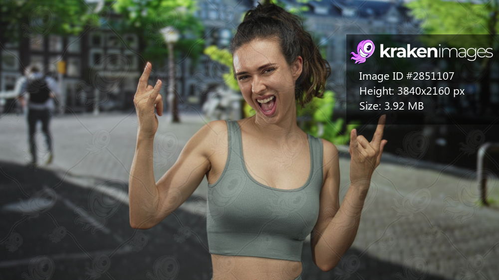 Sunlit urban woman in tanktop hands making rock horns gesture in bustling street; rock metal rebellion fun.