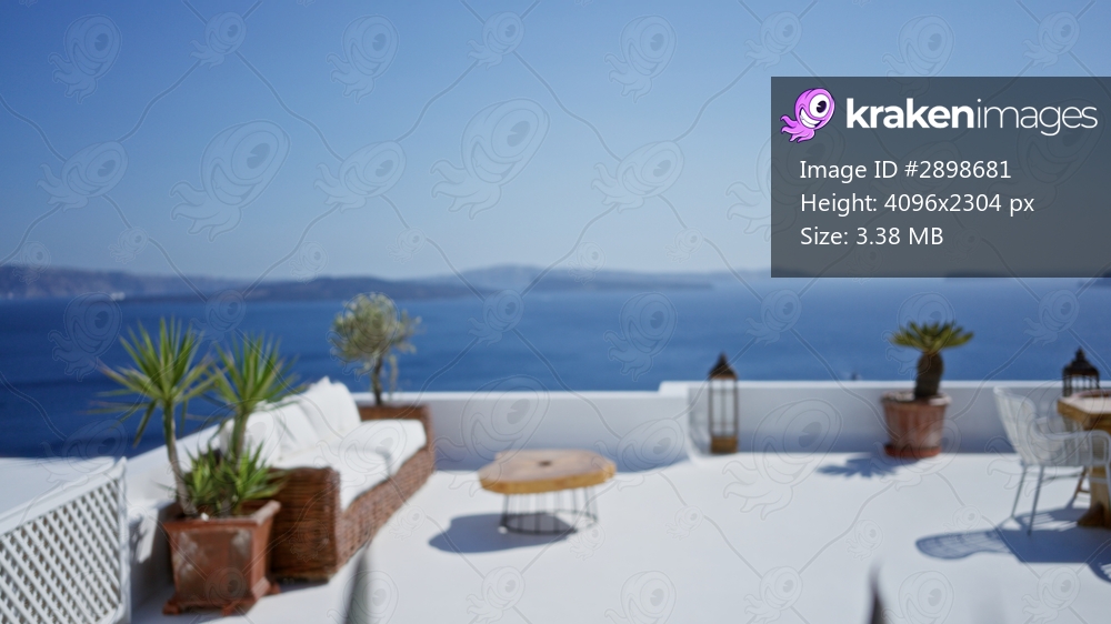 Sunlit white terrace with wicker sofa and potted plants, soft blurred bokeh sea horizon outdoor; background backdrop copyspace calm.