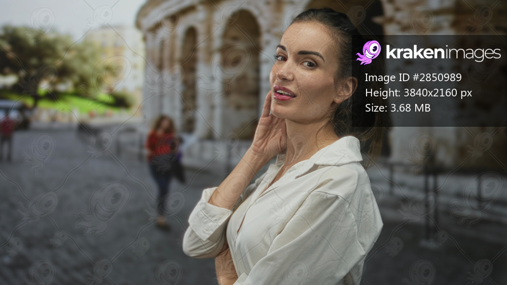 Sunlit woman in white shirt touches ear near ancient roman coliseum building in city square; serenity.