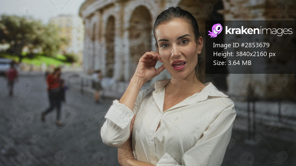 Sunlit woman in white shirt touches ear near ancient roman coliseum building in city square; serenity.