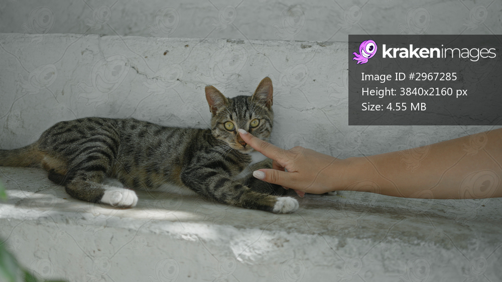 Tabby cat lying on concrete step with human finger touching paw in building; trust connection calm gentle.