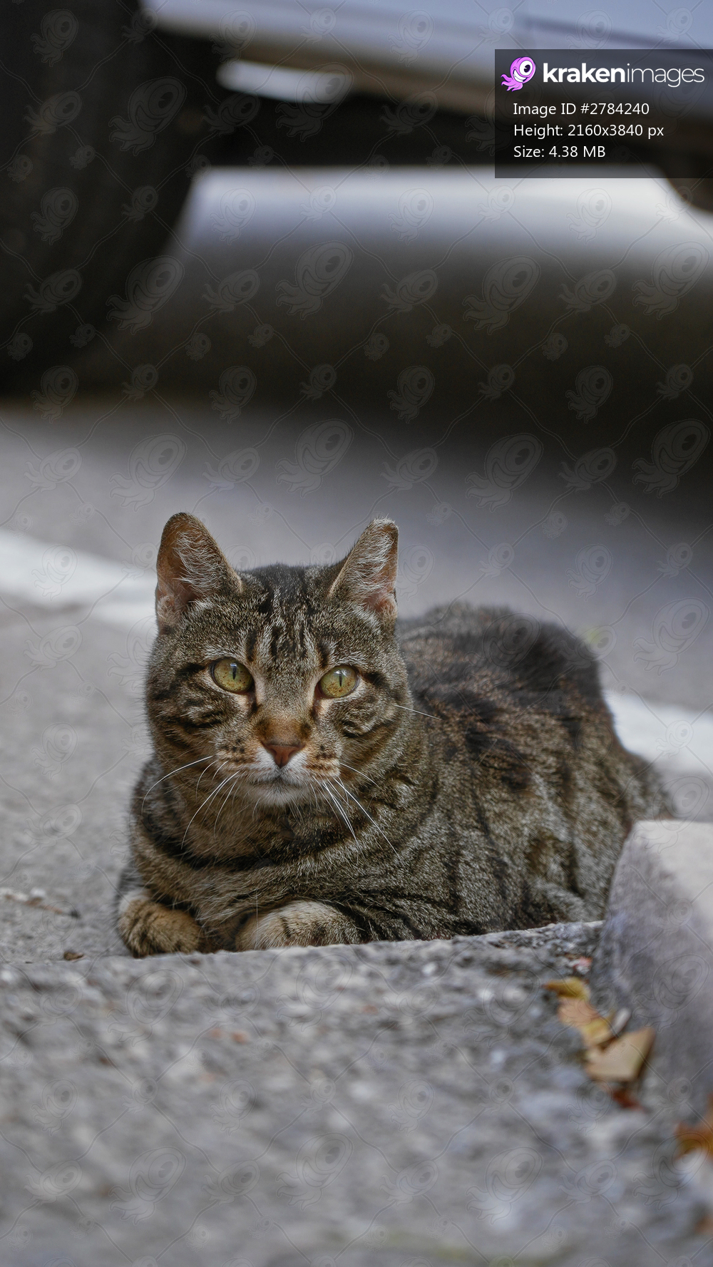 Tabby cat resting on asphalt in outdoor parking area surrounded by cars, showcasing urban environment with concrete and vehicles.