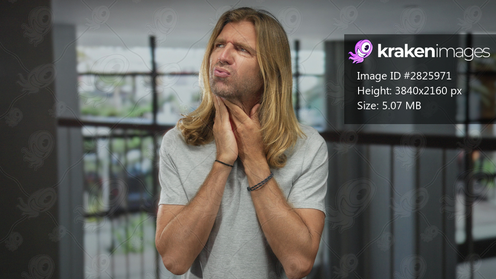Tall blond man with long hair clutching throat while standing in empty studio room; physical discomfort.