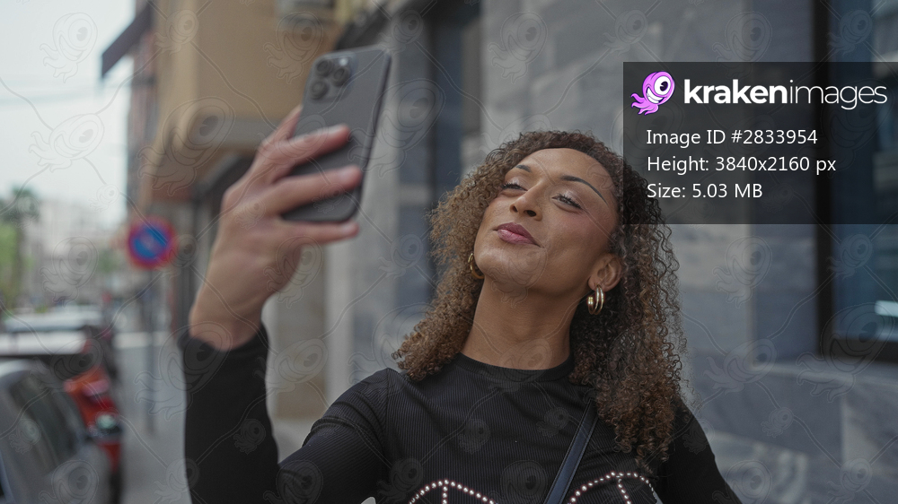 Tall transgender woman holds smartphone at arm’s length smiling on street wearing hoop earrings; confidence.