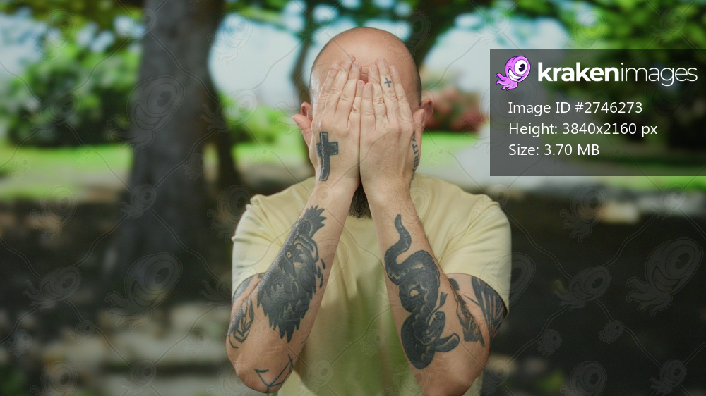 Tattooed bald man with beard playfully interacts in a park, covering and uncovering his face during a sunny day outdoors, showcasing intricate tattoos on his arms and hands. - Kraken Images