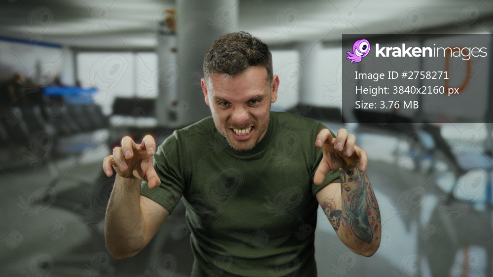Tattooed man stretching face muscles inside airport terminal with distant chairs and signage visible.