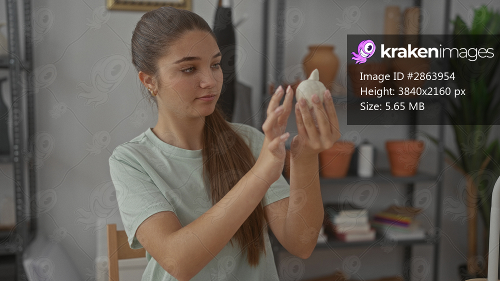 Teen artisan girl holds round clay sculpture with hands in studio, surrounded by earthenware pots on shelves; creativity.