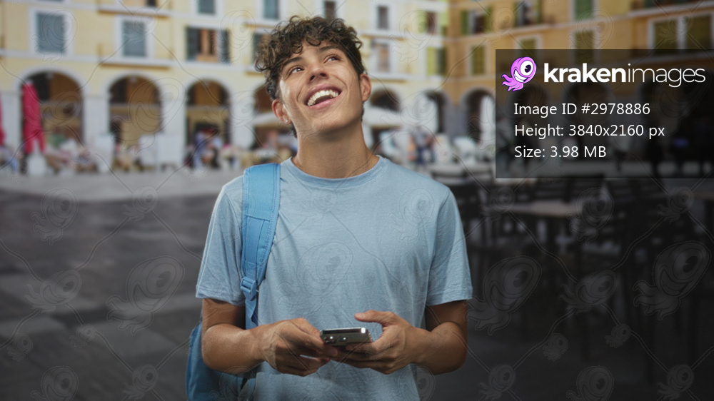 Teen boy with backpack holds smartphone and smiles while looking up on a sunlit plaza street with cafe tables and arches behind him; joy curiosity.