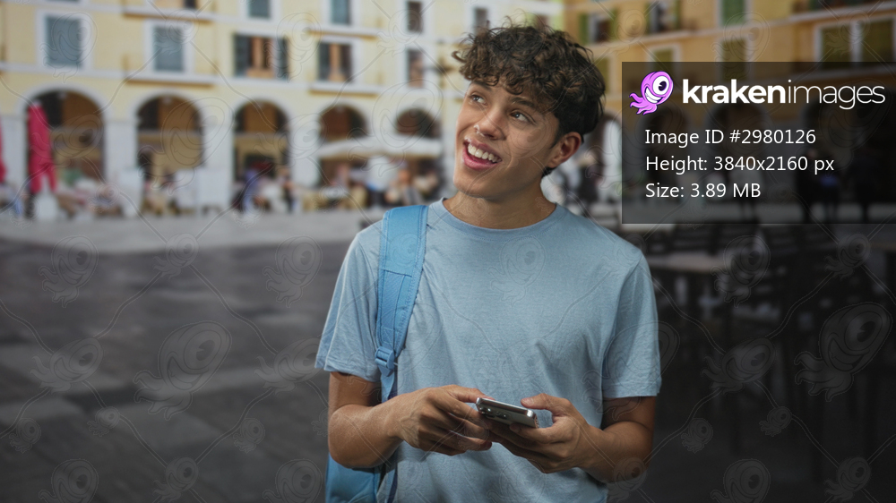 Teen boy with backpack holds smartphone and smiles while looking up on a sunlit plaza street with cafe tables and arches behind him; joy curiosity.