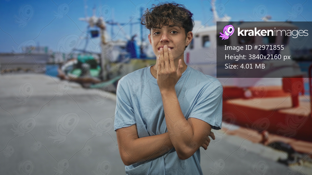 Teen boy finger to lips for silence with crossed arm at dock beside fishing boat and moored vessel; hush curiosity.