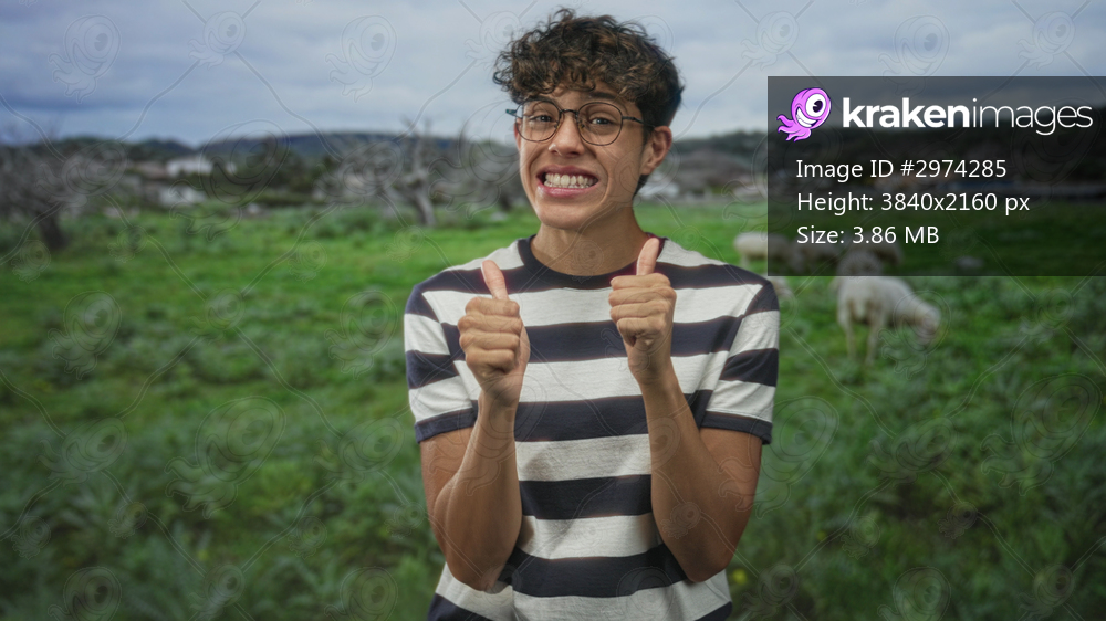 Teen boy giving thumbs up and smiling in a green pasture with grazing sheep near a building; cheerful optimism.