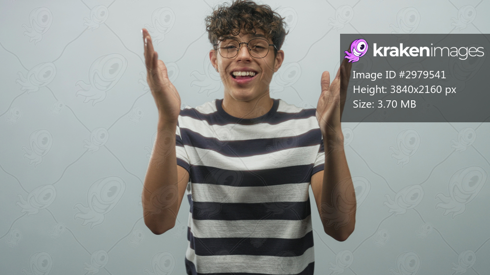 Teen boy with glasses points index fingers upward while smiling in a studio wearing striped shirt; playful joy.