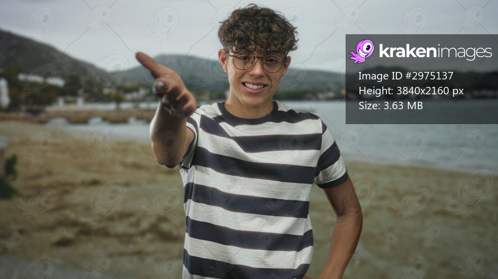 Teen boy with glasses reaches out hand for handshake on sandy beach by a lake with mountains and pier visible; welcoming.