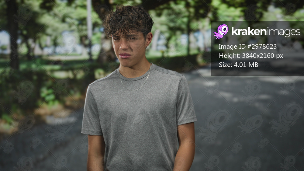 Teen boy grimacing with hand held out and silver chain visible, wearing gray tshirt on a street; disgust.