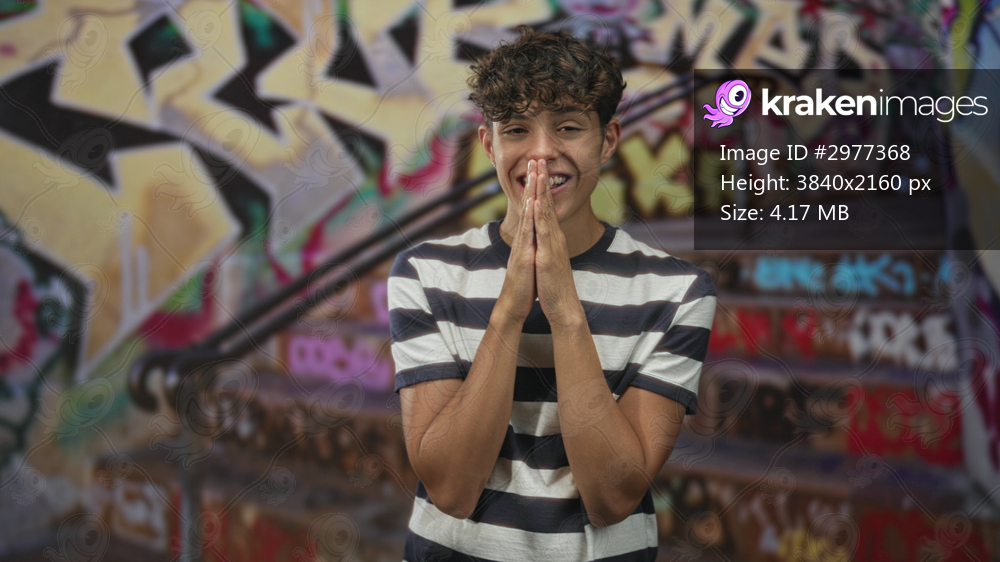 Teen boy with hand over mouth and crossed arm, wearing a striped shirt, standing by graffiti covered stairs and a metal railing on a street; surprise vulnerability. - Kraken Images