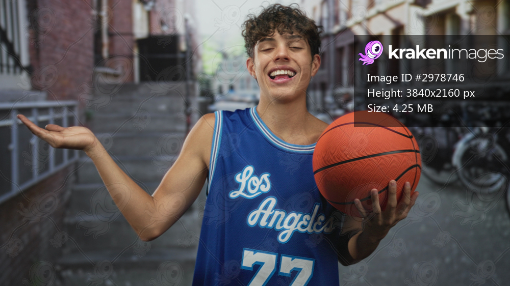 Teen boy holding a basketball with palm up shrug gesture, wearing a los angeles 77 jersey on a city street by steps and parked bicycles; playful confidence. - Kraken Images