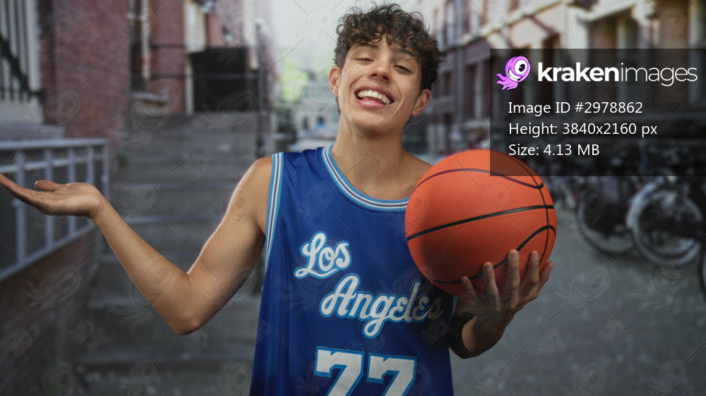 Teen boy holding a basketball with palm up shrug gesture, wearing a los angeles 77 jersey on a city street by steps and parked bicycles; playful confidence. - Kraken Images