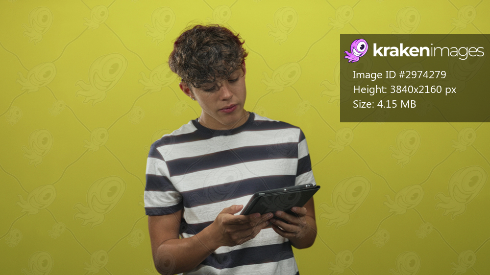 Teen boy holding a tablet, tapping the touchscreen and smiling while reading in a studio with yellow backdrop; youthful curiosity joy.