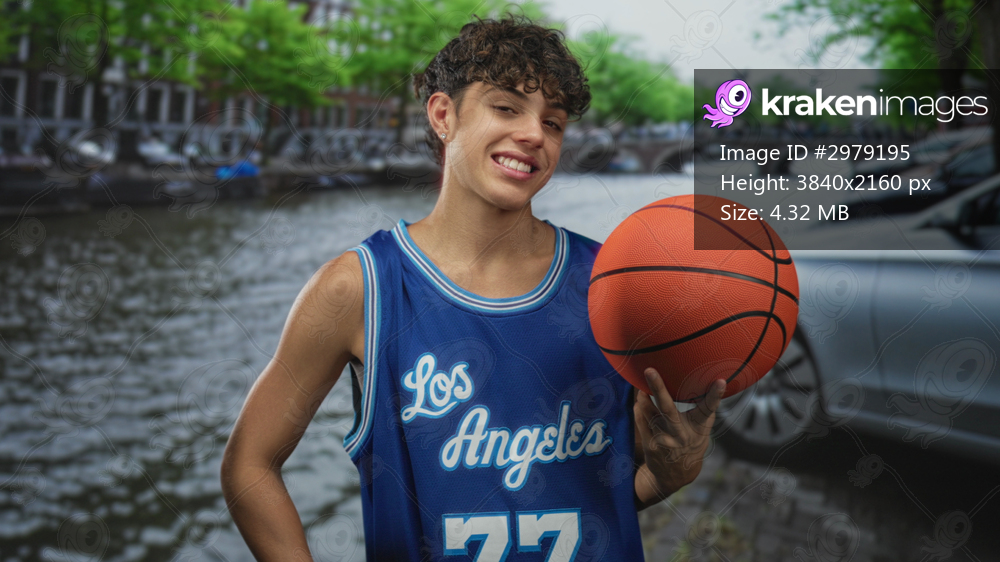 Teen boy holding basketball and smiling in a sleeveless jersey on a street beside a canal and parked cars; urban youth confidence.