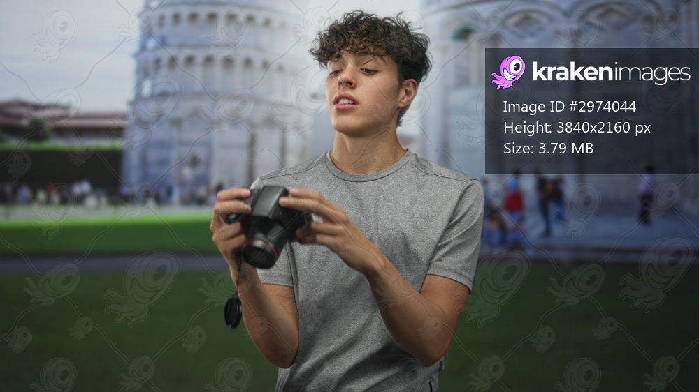 Teen boy holding dslr camera, hands adjusting lens in building at pisa tower; curiosity travel discovery.