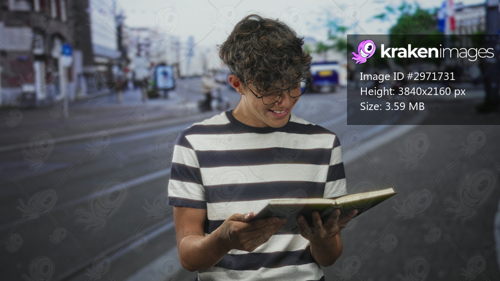 Teen boy holding open book reading on street with glasses and striped shirt, looking engaged; curiosity.