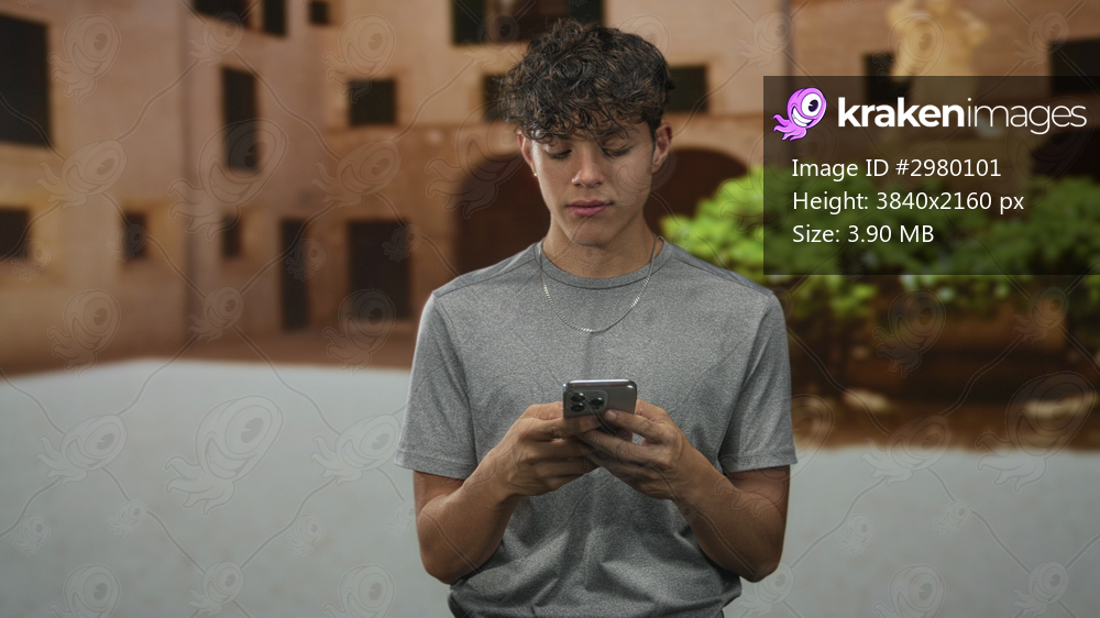 Teen boy holding smartphone with hands, looks down at phone wearing gray tshirt in building courtyard; pensive solitude connection focus.