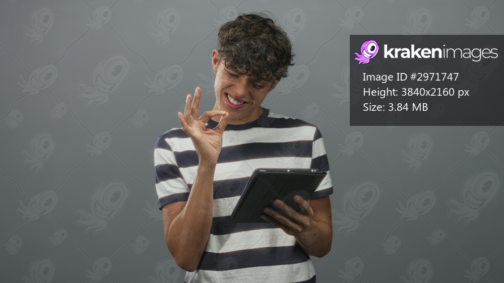 Teen boy holding tablet and making ok hand gesture in studio while reading and reacting to on screen content; learning satisfaction.