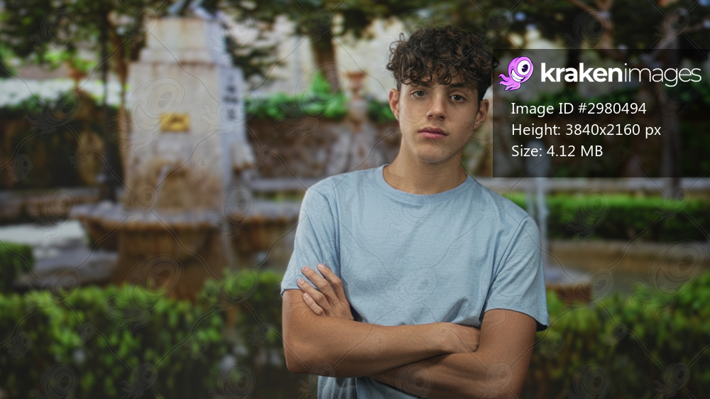 Teen boy in a blue tshirt standing with arms crossed and direct gaze by a stone fountain in a public park, framed by hedges and trees; youth confidence independence. - Kraken Images
