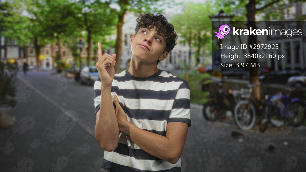 Teen boy in a striped shirt pointing finger upward with exposed forearm on a city street beside parked bicycle and lamppost; curiosity daydreaming imagination. - Kraken Images