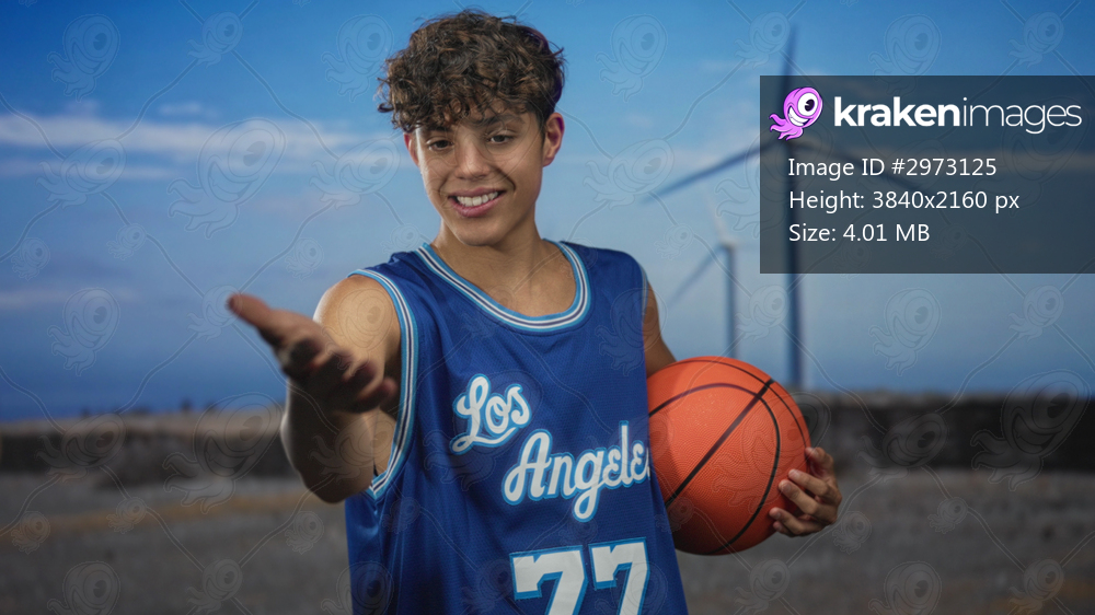 Teen boy in blue los angeles jersey holds basketball and reaches hand forward on a street; friendly invitation.