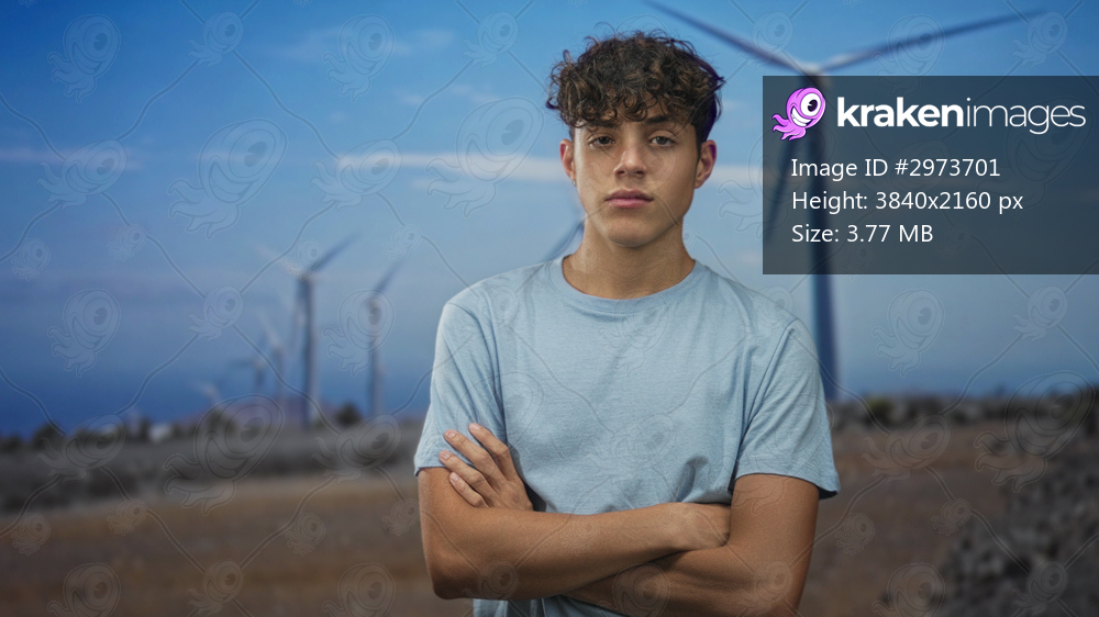 Teen boy in light blue tshirt with crossed arms and visible forearms standing by wind turbines on a street under a blue sky; quiet determination.