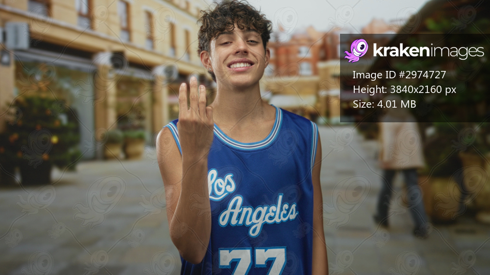 Teen boy in los angeles basketball jersey showing three fingers with hand raised on a street lined with shops and potted plants; playful confidence.