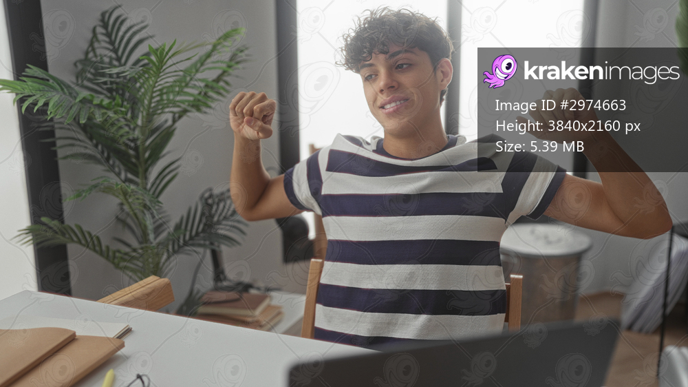 Teen boy in striped shirt at laptop raises fists and leans back at desk with notebooks and plant in studio; relief study break.