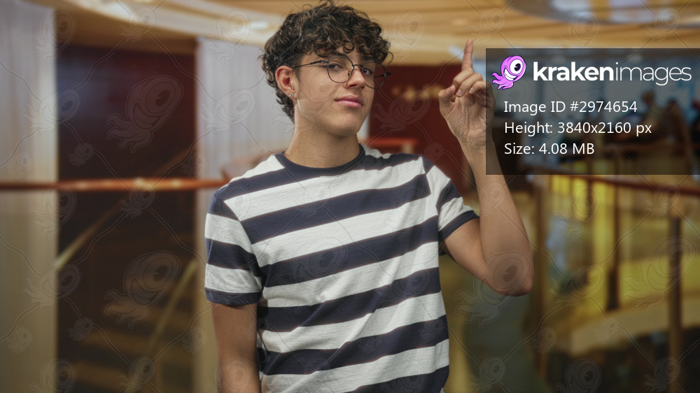 Teen boy in striped tshirt and glasses giving thumbs up and open hands gesture in a public building atrium; playful optimism.