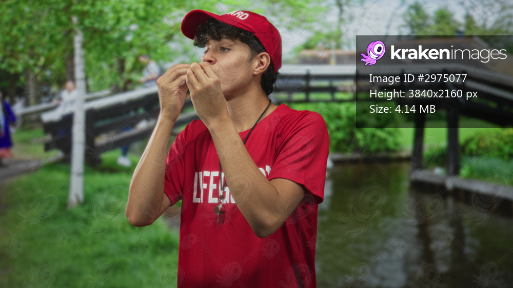 Teen boy lifeguard blowing whistle with mouth and raised arms beside a canal bridge; vigilance duty.