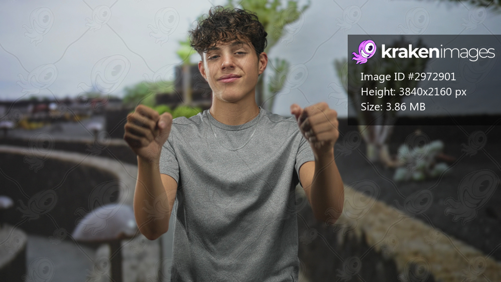 Teen boy miming steering with hands on street in grey tshirt and chain necklace, smiling near cactus planters and curved stone walkway; playful.