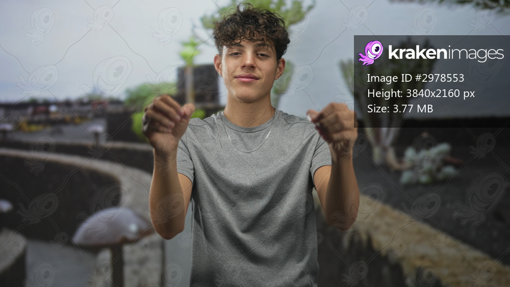 Teen boy miming steering with hands on street in grey tshirt and chain necklace, smiling near cactus planters and curved stone walkway; playful.