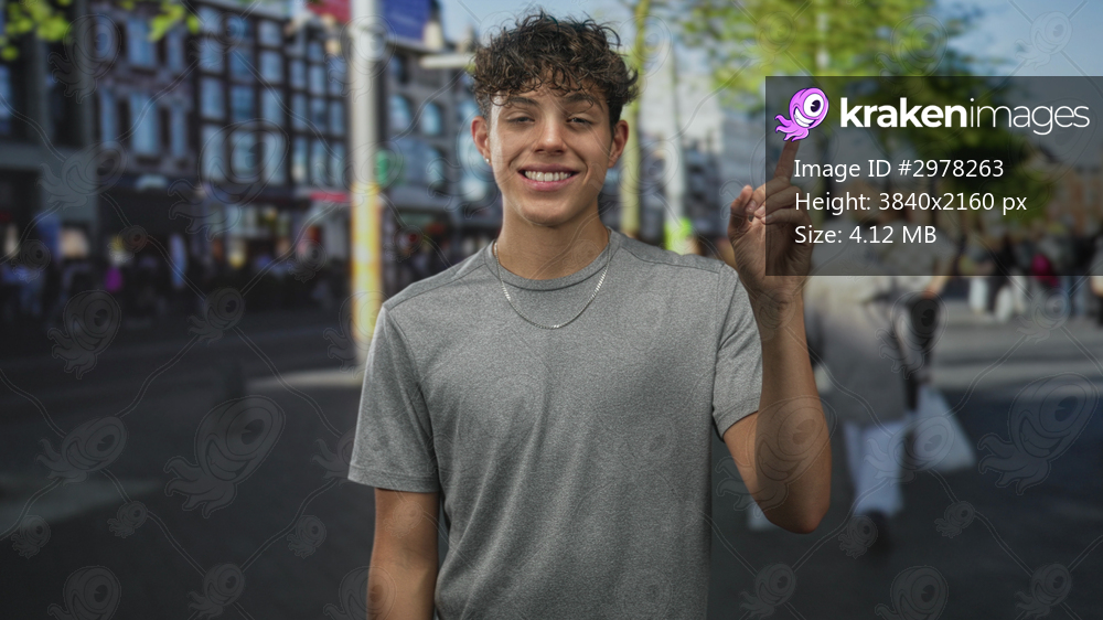 Teen boy pointing finger upward with visible hand and necklace, smiling in grey tshirt on street amid crowd and buildings; playful confidence.