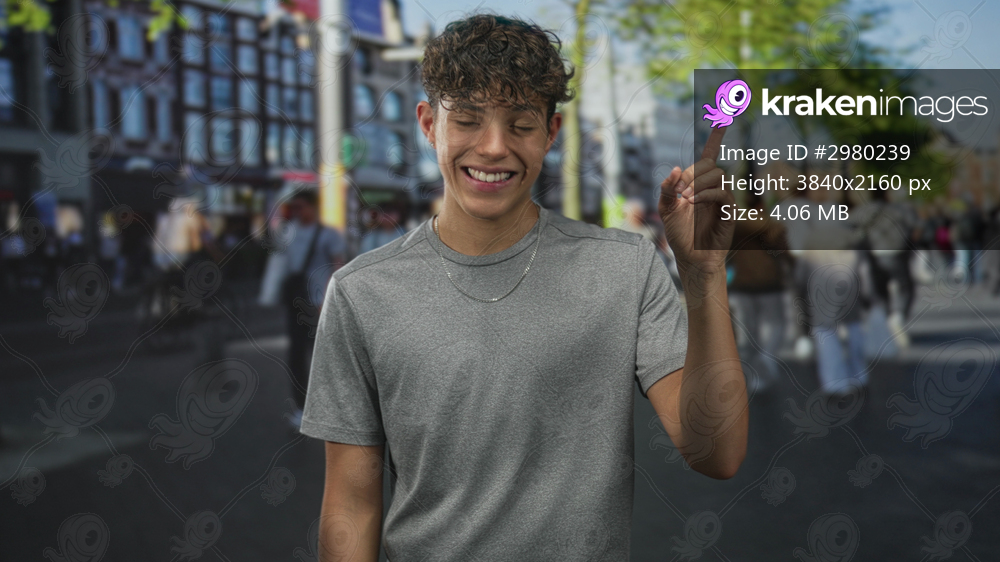 Teen boy pointing finger upward with visible hand and necklace, smiling in grey tshirt on street amid crowd and buildings; playful confidence.