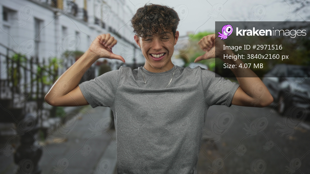 Teen boy pointing thumbs to chest on a residential street wearing gray t shirt and silver chain, smiling with eyes closed; playful confidence.