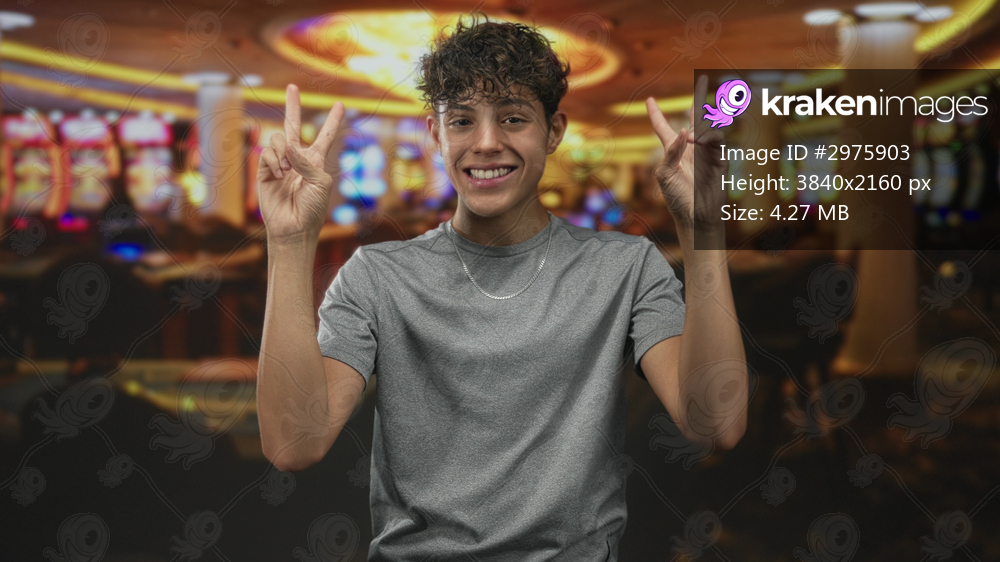 Teen boy smiling holding peace signs with hands in a studio with casino slot machines visible; joy celebration.