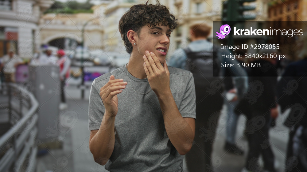 Teen boy touching cheek with hand, grimacing while standing on a busy street with passersby; awkward introspection.