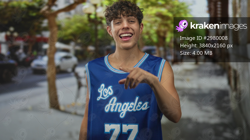 Teen boy wearing blue los angeles basketball jersey smiles with eyes closed and gestures with hands on a city street; youthful joy.