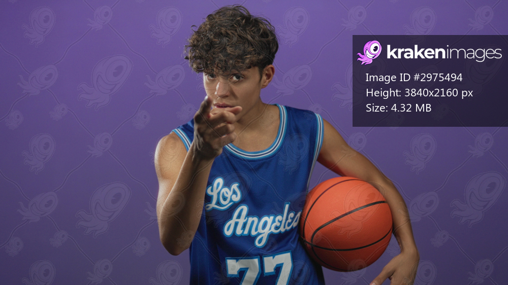 Teen boy wearing los angeles jersey holding basketball points finger at camera in studio; confidence determination.