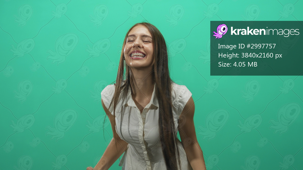 Teen girl with braces and long brown hair, fists clenched with arms raised and smiling broadly in a green screen studio; joy.